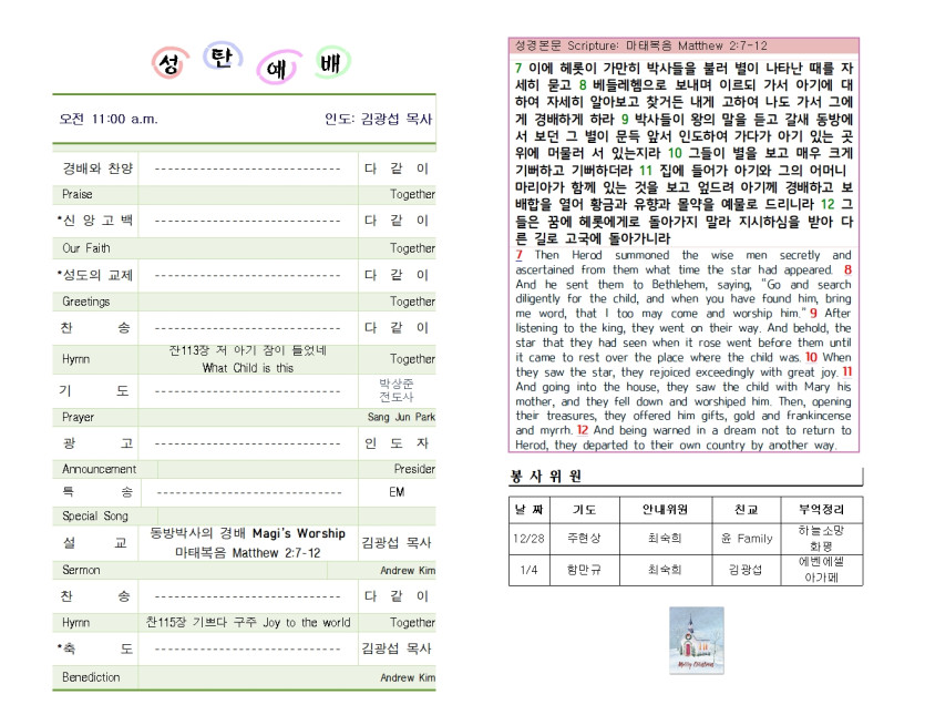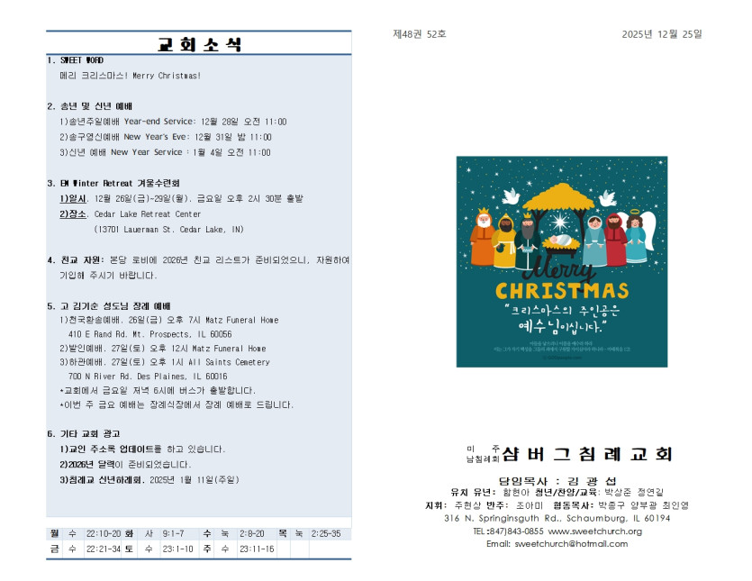 December 28, 2025 . 샴버그침례교회 2025년 12월 25일 성탄절 교회 주보