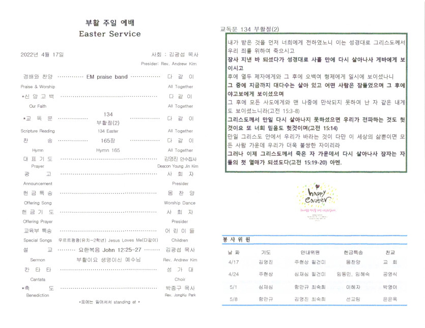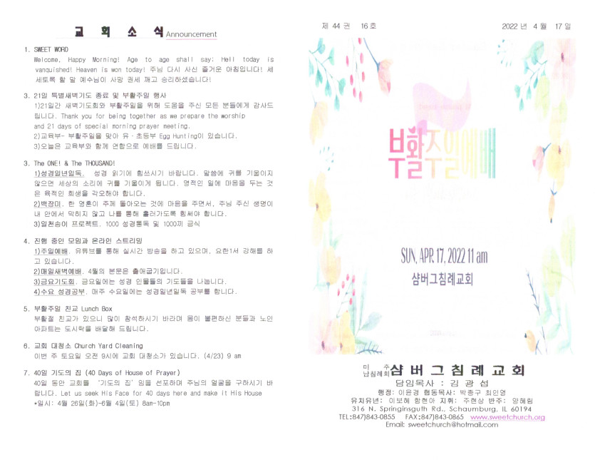 May 01, 2022 . 샴버그침례교회 2022년 4월 17일 주보