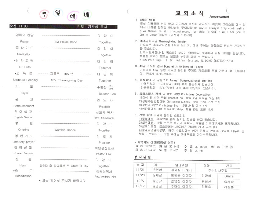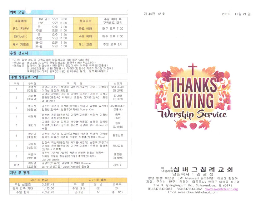November 30, 2021 . 샴버그침례교회 2021년 11월 21일 추수감사주일 주보