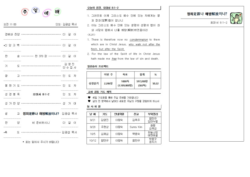 September 21, 2025 . 샴버그침례교회 2025년 9월 21일 교회 주보
