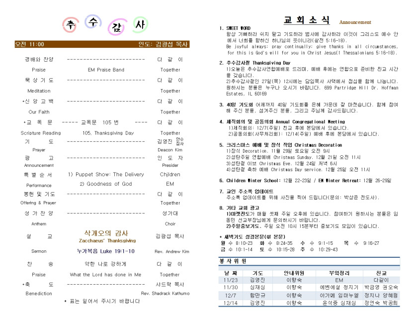 November 23, 2025 . 샴버그침례교회 2025년 11월 23일 교회 주보