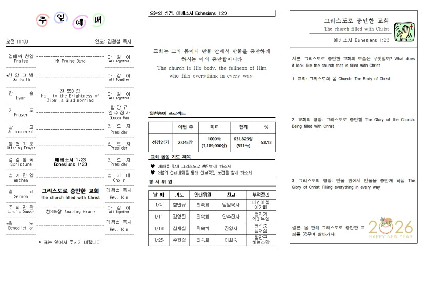 January 04, 2026 . 샴버그침례교회 2026년 1월 4일 교회 주보